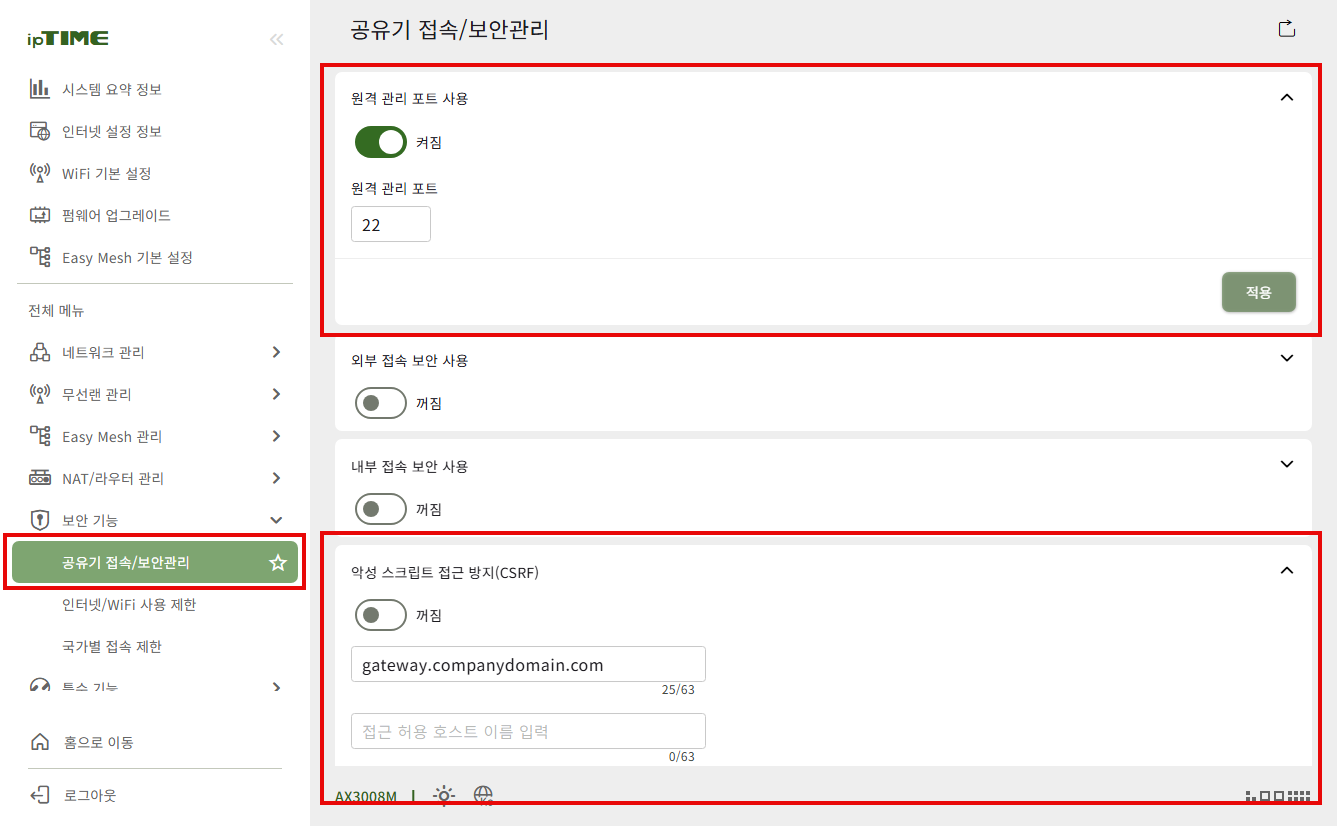또한 공유기 접속/보안 관리 메뉴 상단에서 "원격 관리 포트 사용" 이 체크되어 있고