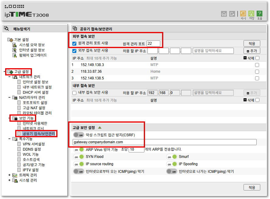2. ipTIME 의 고급 보안 설정